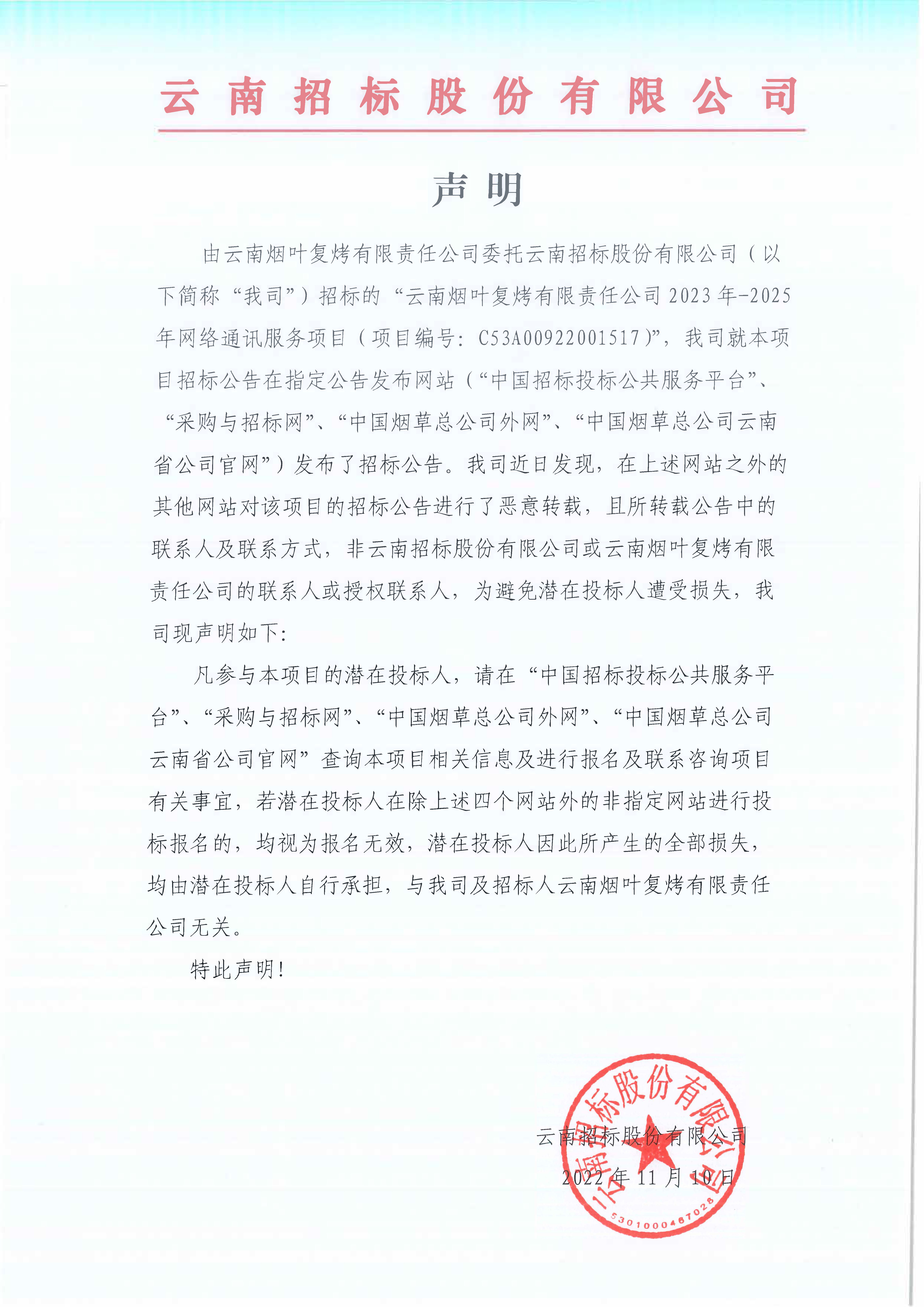 由云南烟叶复烤有限责任公司委托云南招标股份有限公司(以下简称“我司”)招标的“云南烟叶复烤有限责任公司2023年-2025年网络通讯服务项目(项目编号:C53A00922001517)”,我司就本项目招标公告在指定公告发布网站(“中国招标投标公共服务平台”、“采购与招标网”、“中国烟草总公司外网”、“中国烟草总公司云南省公司官网”)发布了招标公告。我司近日发现,在上述网站之外的其他网站对该项目的招标公告进行了恶意转载,且所转载公告中的联系人及联系方式,非云南招标股份有限公司或云南烟叶复烤有限责任公司的联系人或授权联系人,为避免潜在投标人遭受损失,我司现声明如下: